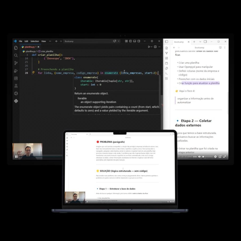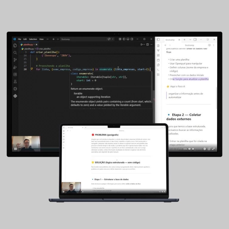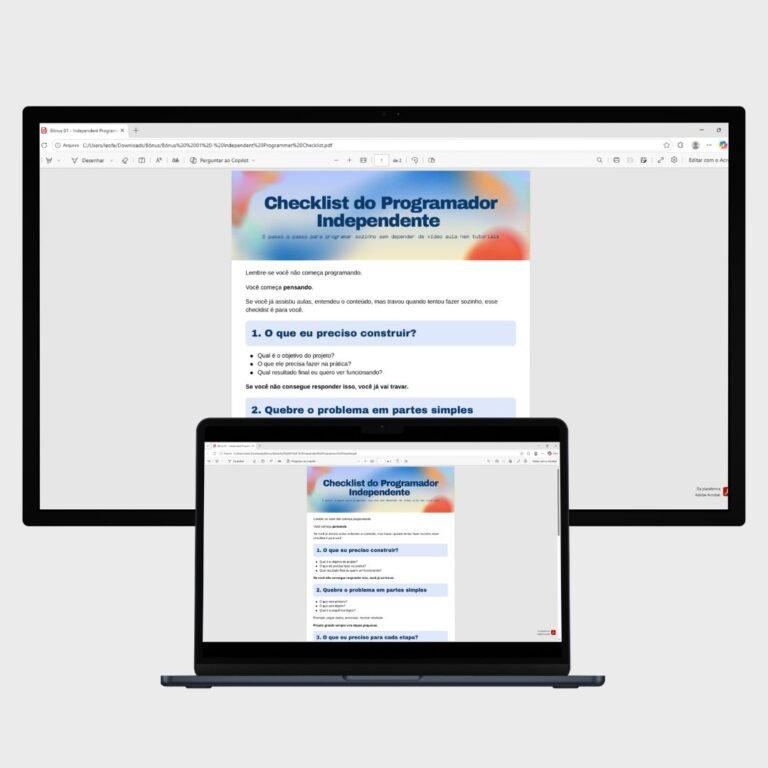 A proposta aqui não é copiar código. Você vai aprender como pensar, estruturar e executar projetos — para conseguir criar suas próprias soluções sem depender de tutorial.